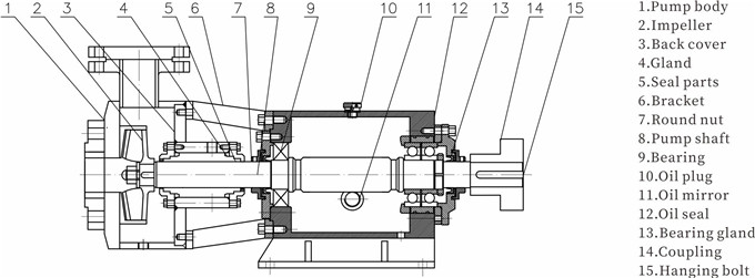 1、FSB-L fluoroplastic reinforced alloy pump is composed of pump body, impeller, back cover, gland, seal parts, bracket, pump shaft, bearing, coupling, hanging bolt, nut and base plate.