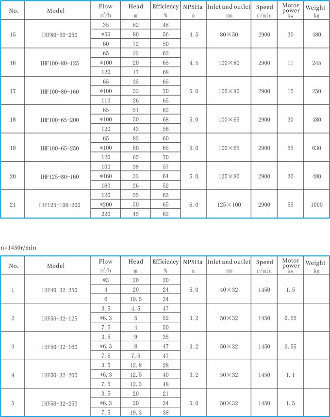 The IHF series centrifugal pump is designed according to international standards. The pump body is made of metal shell with fluorine plastic. The impeller and the pump cover are made of metal inserts and fluoroplastic alloy. The shaft seal is made of advanced external bellows mechanical seal. The static ring uses 99.9% alumina ceramics, and the moving ring uses PTFE filling material (or other materials according to the user's special working conditions), which is characterized by good corrosion resistance,wear resistance and good sealing .